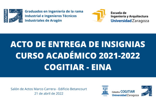 COGITIAR y la Escuela de Ingeniería y Arquitectura de la Universidad de Zaragoza celebraron el pasado 21 de abril el acto académico de imposición de insignias a los alumnos graduados durante el curso académico 2021-2022, al que asistieron más de 100 alumnos de las diferentes especialidades de la Ingeniería Industrial.