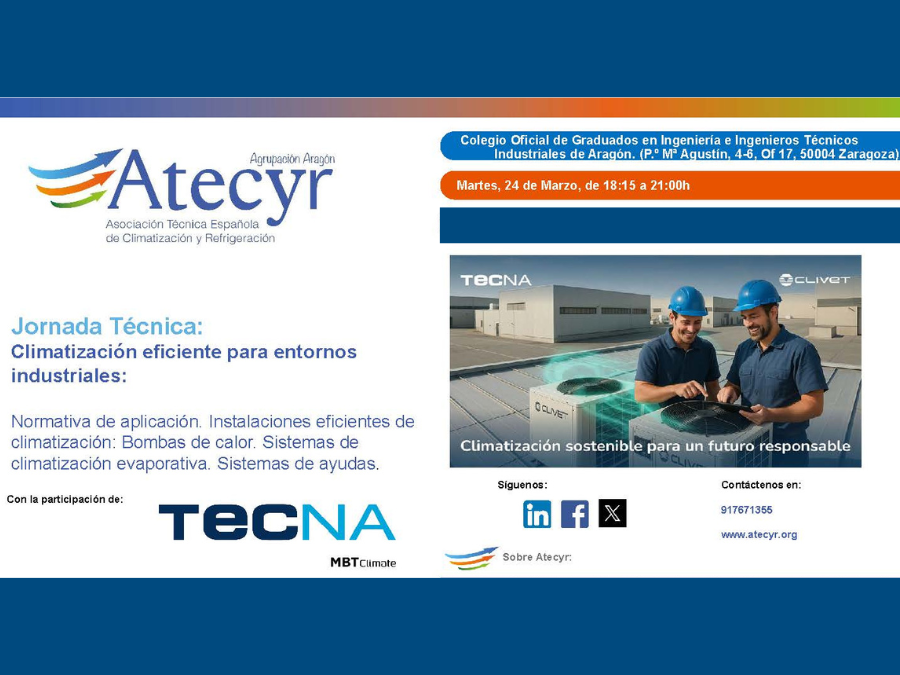 El próximo martes 24 de marzo, de 18.15 a 21.00 en el Salón de Actos del COGITIAR, sede de Zaragoza, Atecyr organiza una Jornada Técnica gratuita que abordará el tema “Climatización eficiente para entornos industriales»: Normativa de aplicación. Instalaciones eficientes de climatización: Bombas de calor. Sistemas de climatización evaporativa. Sistemas de ayudas.